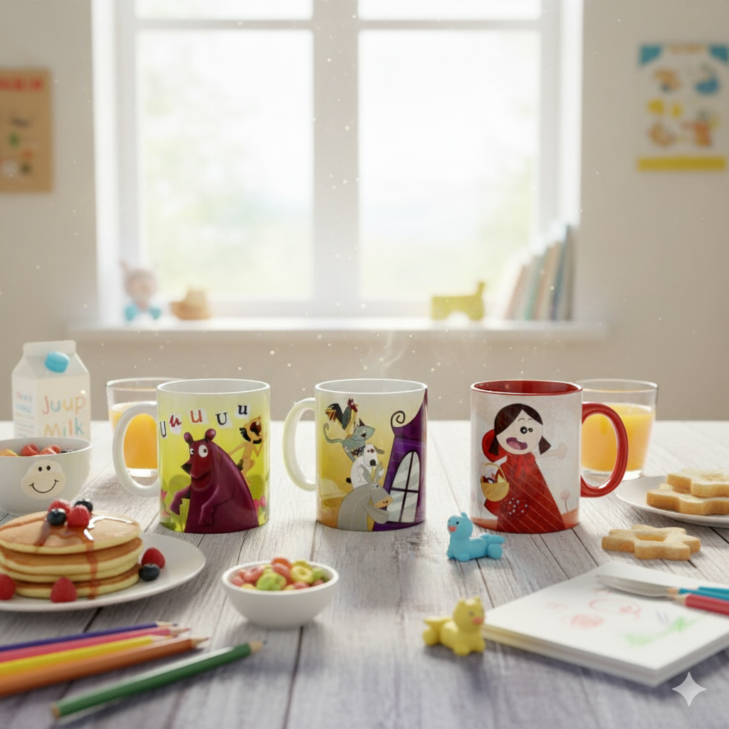 Taza de cerámica con la ilustración de los personajes de Caperucita Roja y el lobo, cada uno en un lado de la taza.